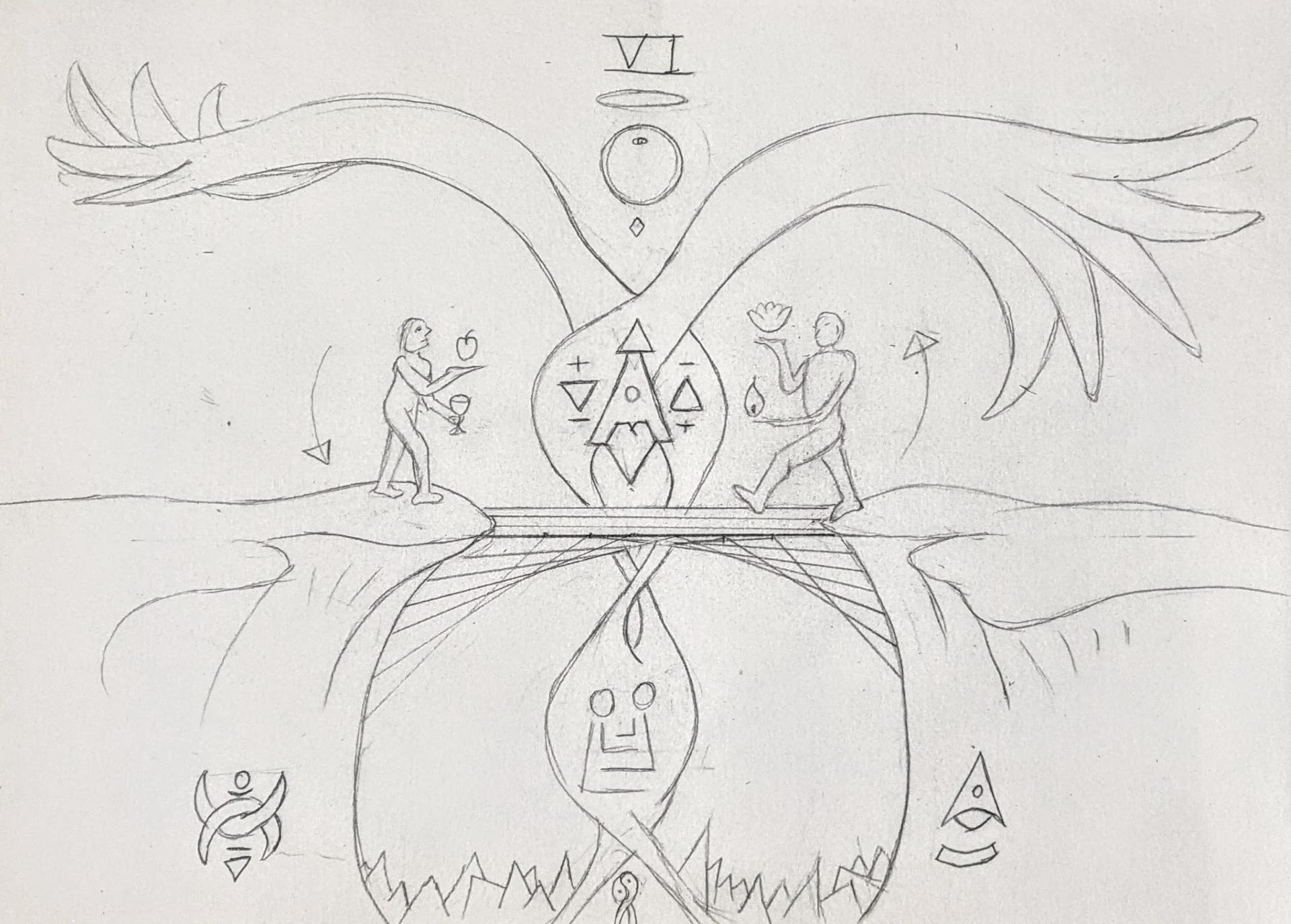 Both character in the drawing are moving towards stepping off a cliff much like the very first archetype: The Fool. Except this time they can do so with confidence as they have manifested a bridge to walk on that connect eachother. This archetype has some similarities to the Fool Archetype in that both archetypes have a playful optimism and are a “Yes” to whatever the moment brings. There can be excitement, jokey banter and taking things lightly. Both archetypes risk failing, as falling out of love or being seen as foolish can be quite painful. This is represented by the spikes at the bottom of both artworks.